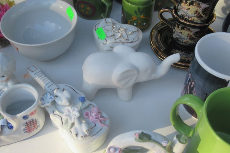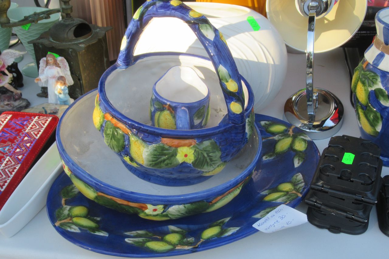 Wśród sprzedających można było spotkać Pana oferującego stare zegary oraz Panią sprzedającą kryształy. Oferowane były również kolorowe szkło z epoki PRL oraz drobne stoiska z biżuterią i innymi przedmiotami kolekcjonerskimi. Jedno ze stoisk wyróżniało się technikaliami, a inne prezentowały porcelanę oraz zabawki dla dzieci – puzzle, konia na biegunach i rowery.